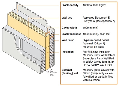 MASONRY LIGHTWEIGHT AGGREGATE WALL - Knauf Insulation Masonry Party Wall Slab or Superglass Party Wall Roll or URSA Cavity Batt 35 - 100mm (min) cavity (gypsum-based board)