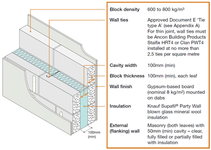 MASONRY - AIRCRETE BLOCKWORK - Knauf Supafil Party Wall Wool 100mm (min) cavity - (gypsum based board)