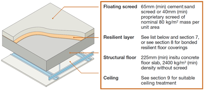 - Bonded resilient floor covering, or floating screed laid on resilient layer system