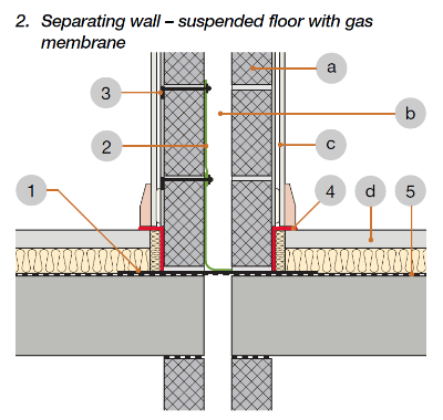 The robustdetails® cavity separating walls state that you should “Make sure there is no connection between the two leaves except for wall ties and foundation (and insulation)”. As the gas membranes are flexible, they won’t in themselves provide an acoustic connection, but mortar droppings and other accumulations will.