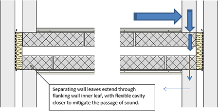 In relation to addressing sound insulation it is possibly worth bearing in mind that the aim of a separating element is to act as a barrier to the passage of sound. In order to be effective the ‘barrier’ therefore needs to be provided to the full extent required. It is for this reason that the junction of a separating wall with a flanking wall requires that the separating wall leaves extend through the inner leaf of the associated flanking wall. This is as shown in the diagram below.