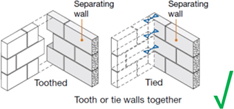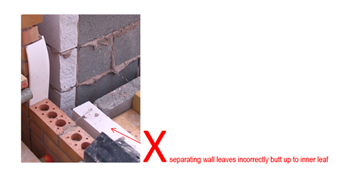 This may have been done, albeit incorrectly, with the best of intentions – the thought being that the thermal insulation performance might benefit. However, if the separating wall leaves do not continue through the inner leaf (either for the full height or through the use, when appropriate, of a toothed junction – see below) then there is a risk that the sound insulation performance might be affected.