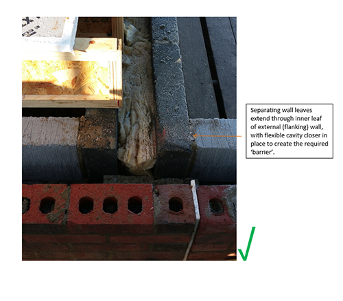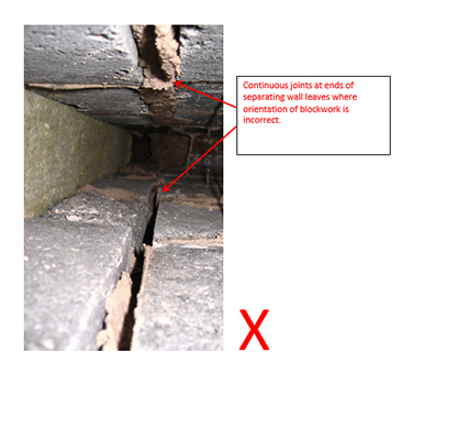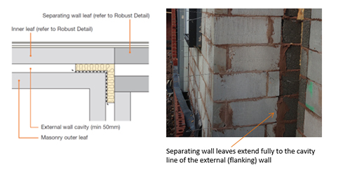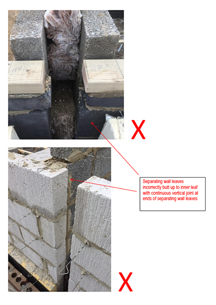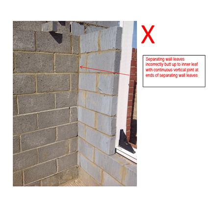 One of the issues identified through the performance monitoring site visits undertaken by Robust Details Limited is the matter of the incorrect orientation of the blockwork leaves at the separating wall/flanking wall junction.